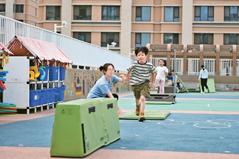 近年來,河北雄安新區(qū)通過創(chuàng)新教育發(fā)展體制機(jī)制、高標(biāo)準(zhǔn)配建教育設(shè)施、引入專業(yè)教師隊(duì)伍、引進(jìn)優(yōu)質(zhì)教育資源等方式,不斷推動教育高質(zhì)量發(fā)展。圖為2024年5月23日,當(dāng)?shù)赜變簣@的孩子們在室外活動。 新華社記者 牟宇/攝