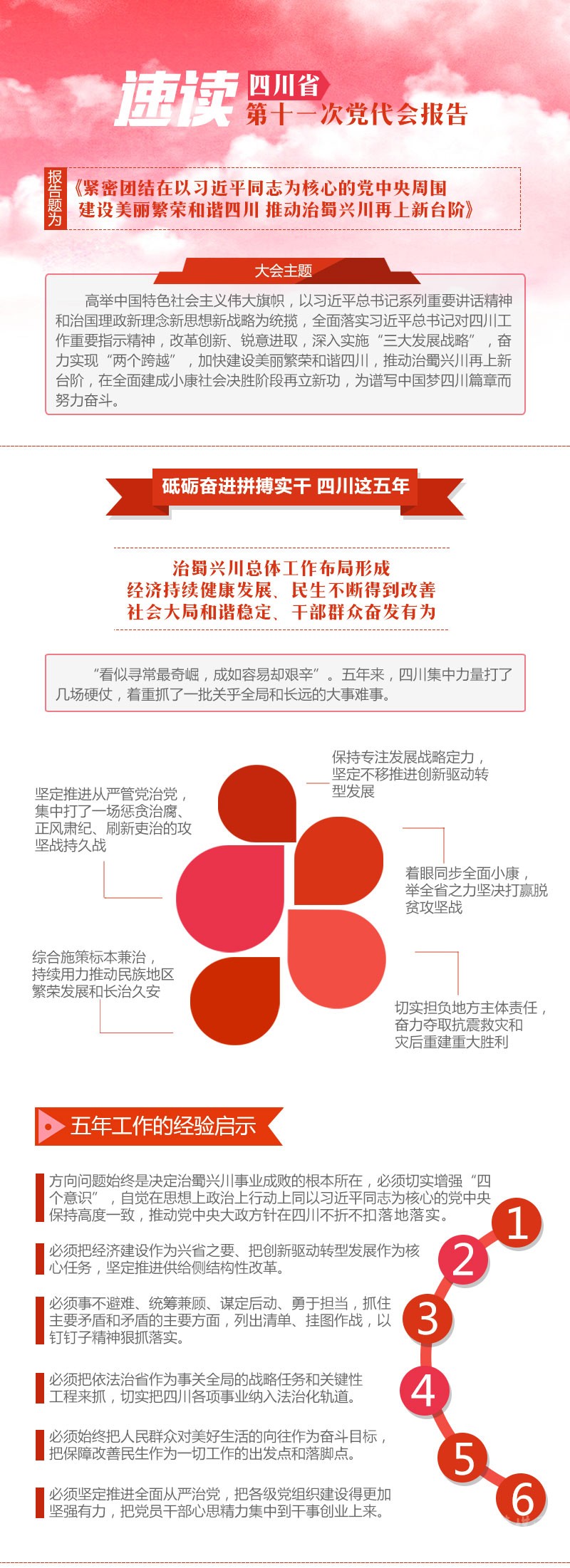 省第十一次黨代會5月24日上午開幕,王東明代表十屆四川省委向大會作報告。四川這五年砥礪奮進拼搏實干取得了怎樣的成績?收獲哪些經(jīng)驗啟示?未來如何開創(chuàng)發(fā)展新局面?