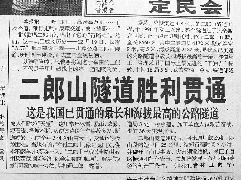 二郎山老路交通瓶頸,影響到甘孜州及西藏地區(qū)經(jīng)濟社會發(fā)展。1996年,二郎山隧道開建,歷時2年,于1998年底貫通?!岸缮剿淼喇敃r是全國最長、海拔最高、地質(zhì)最復(fù)雜的公路隧道,建設(shè)很不容易?!绷中l(wèi)回憶,當年采訪建設(shè)二郎山隧道的鐵道部隧道局三處和武警交通一總隊時,曾聽聞隧道開挖中遇到的各種危險,一名現(xiàn)場指揮長就曾被卷入洪水,所幸后來死里逃生。