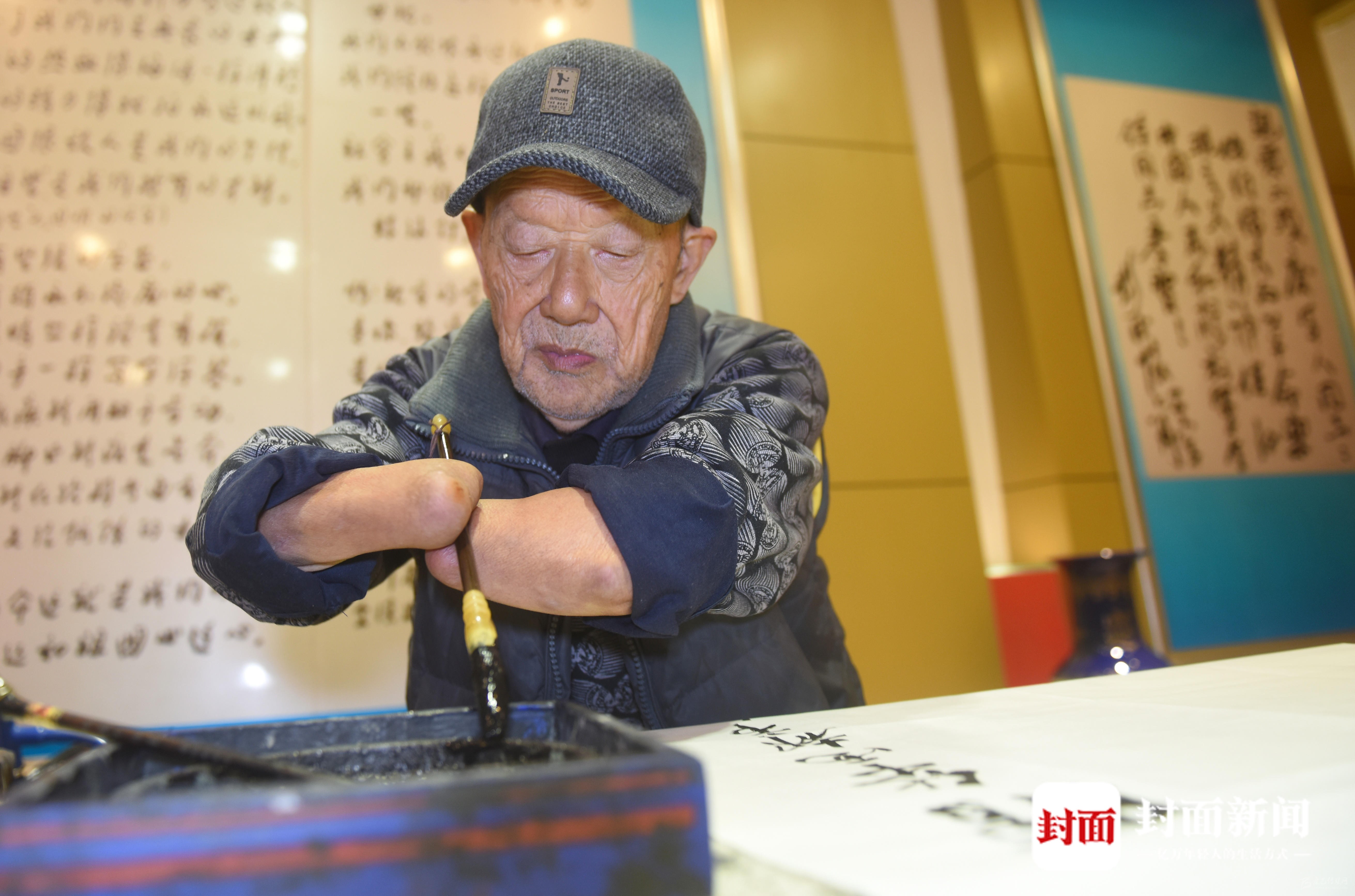 最初,他把鋼筆綁在手臂上,練習了一兩年才做到橫平豎直;之后,他用兩只斷臂抱著毛筆寫書法。