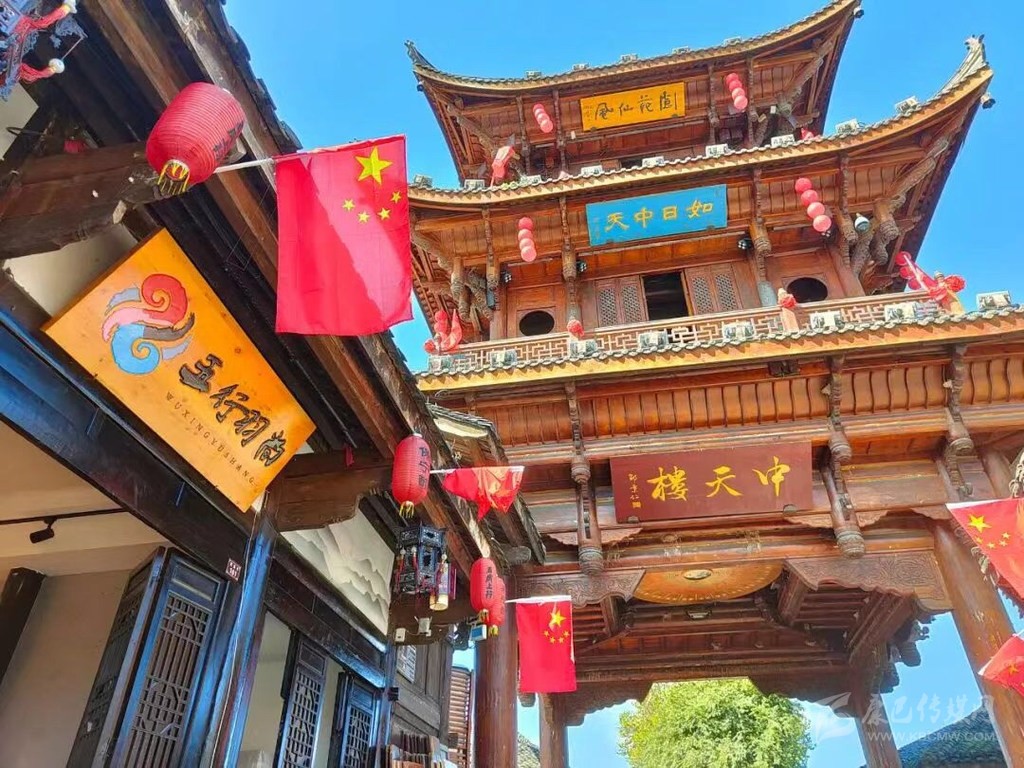 在南充古城閬中,以中天樓為核心鋪開的四條街道,全部被五星紅旗裝點開來,甚至部分街段上空鋪上了“紅旗?!薄P鲁堑闹鞲傻?,也掛上了一面面五星紅旗,站在街頭放眼望去,鮮艷的五星紅旗成為一道最靚麗的風(fēng)景線。