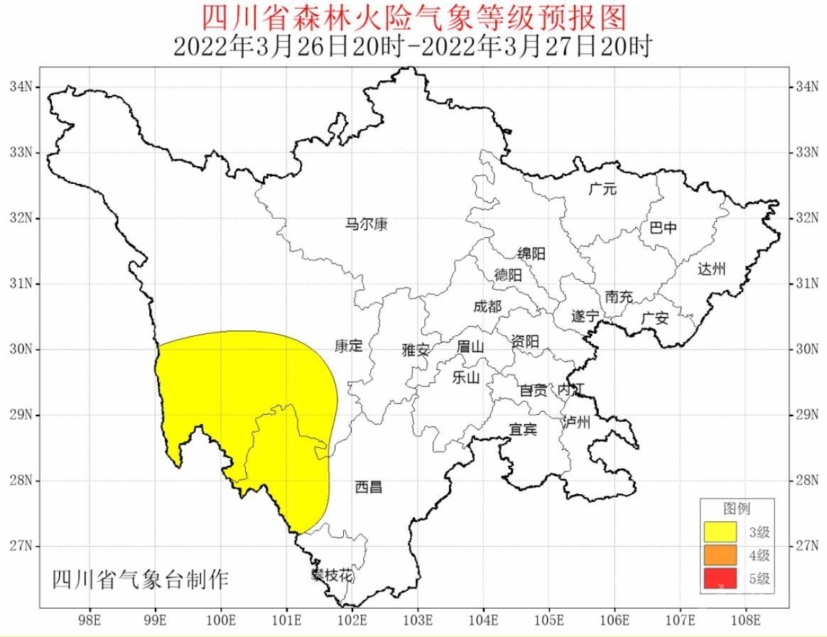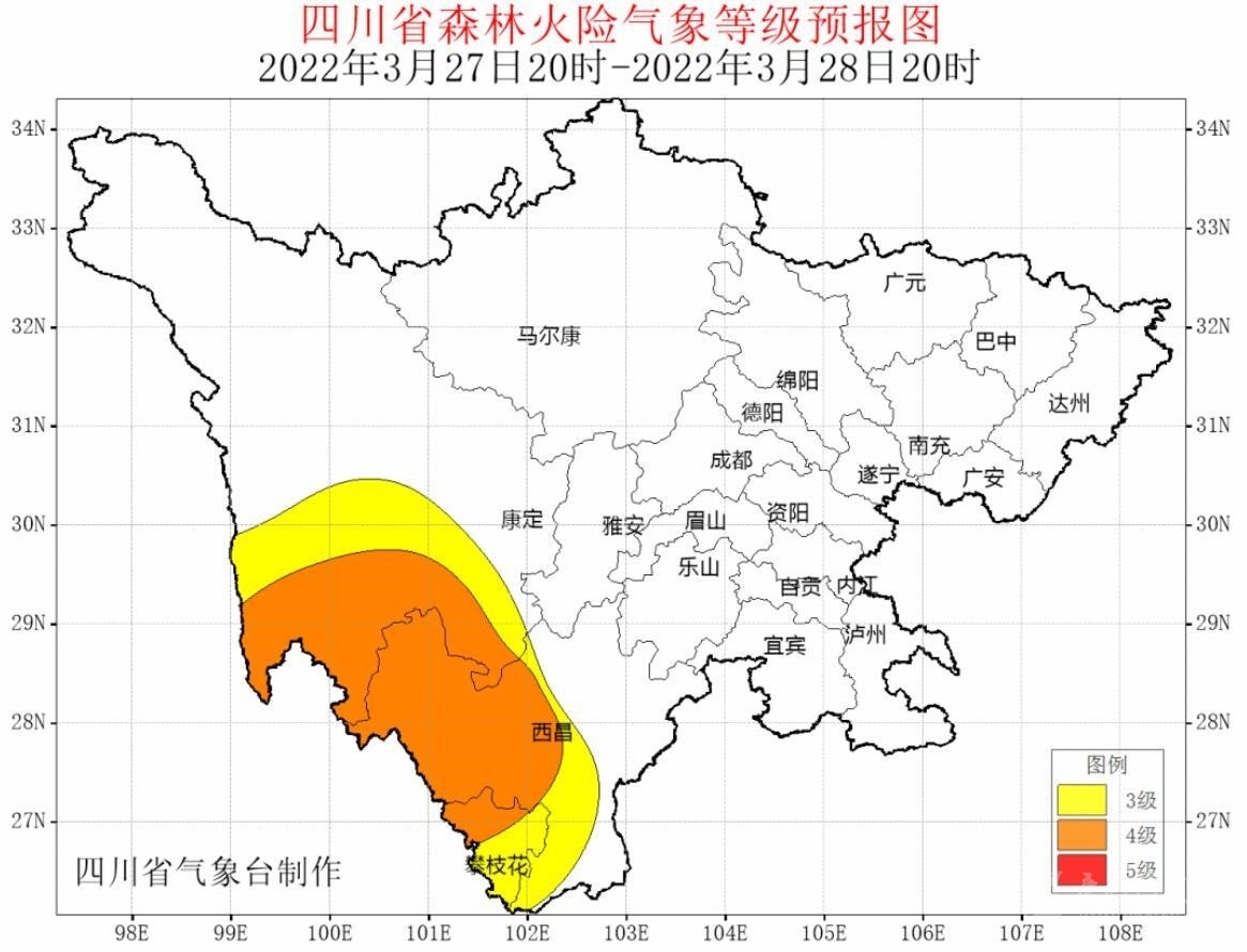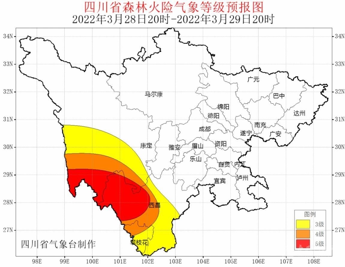 據(jù)最新氣象資料分析:3月27日~29日,攀西地區(qū)西部和甘孜州南部以多云間晴天氣為主,氣溫升高,森林草原火險(xiǎn)氣象等級(jí)可達(dá)3~5級(jí)。