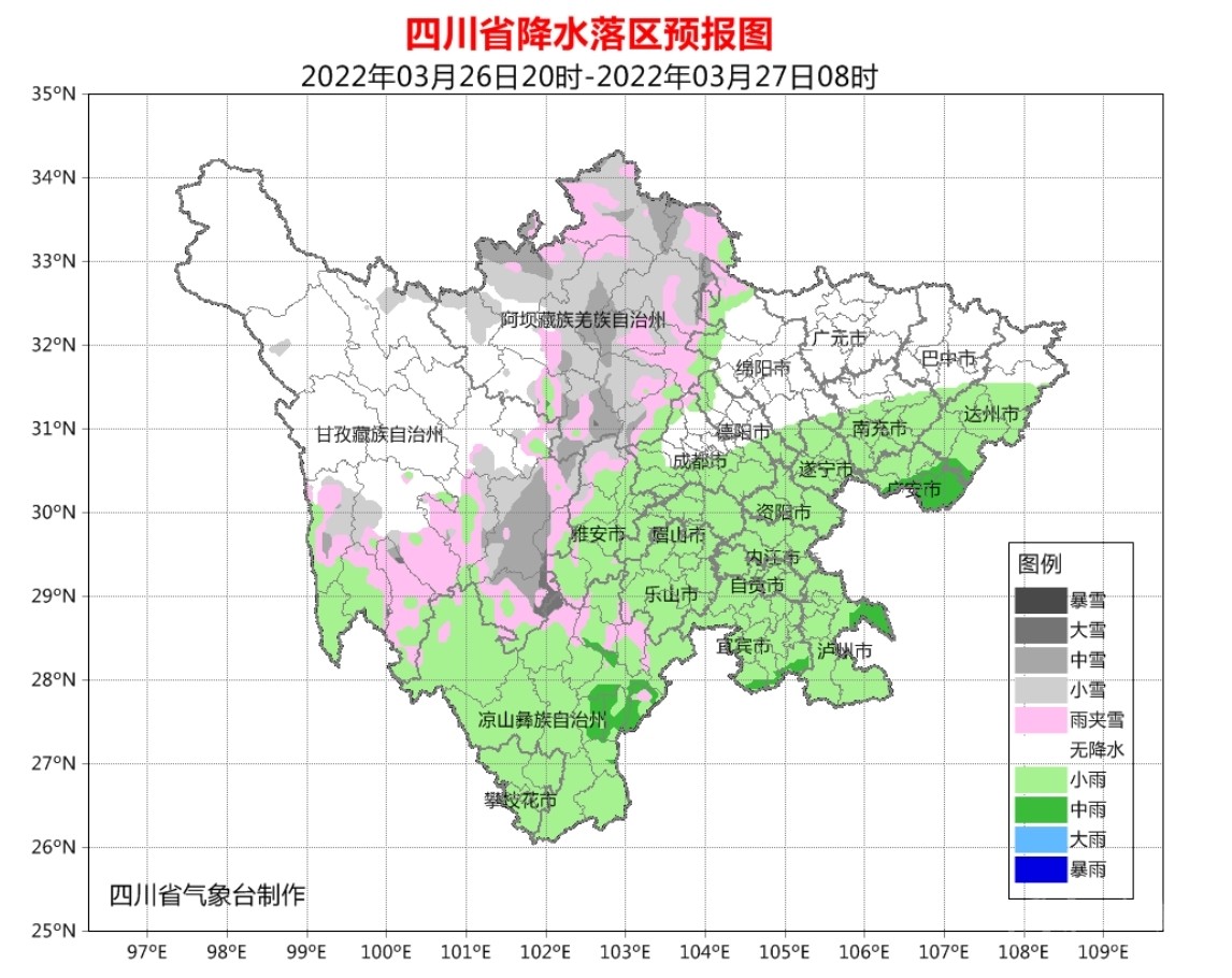 今天晚上:廣元、巴中、綿陽、德陽4市和成都、達(dá)州、南充3市北部陰天,盆地其余地方小雨,廣安、瀘州2市局部有中雨;阿壩州大部和甘孜州南部有陣雪(雨),甘孜州北部陰天;攀西地區(qū)陰天有小雨,局部地方有中雨。