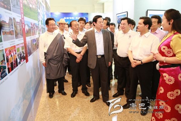 6月8日上午10時,劉奇葆、王正偉來到民族文化宮,首先走進四川甘孜藏區(qū)發(fā)展成就暨旅游圖片展現場。這里,展示的是甘孜藏區(qū)經濟社會發(fā)展成就、自然風光、歷史文化、民族風情、田園藏寨等方面內容的圖片。一幅幅圖片,一個個場景,劉奇葆都非常熟悉。在四川工作期間,他曾十幾次奔赴甘孜藏區(qū)考察,足跡遍布全州18個縣。劉奇葆仔細觀看展示圖片,并不時詢問交通通信、優(yōu)勢產業(yè)等發(fā)展情況以及民生改善的情況。劉奇葆說,甘孜山川秀美,民族風情濃郁,是一方充滿生機和活力的土地,希望甘孜立足自身實際,大力發(fā)展農牧業(yè)和文化旅游業(yè),大力加強生態(tài)建設和環(huán)境保護,大力改善民生,努力走出藏區(qū)科學發(fā)展、跨越發(fā)展之路。