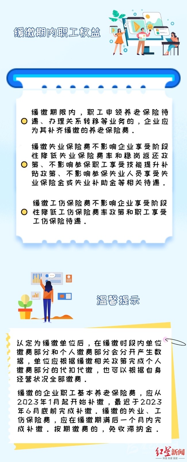 緩繳期限內(nèi),職工申領(lǐng)養(yǎng)老保險待遇、辦理關(guān)系轉(zhuǎn)移等業(yè)務的,企業(yè)應為其補齊緩繳的養(yǎng)老保險費。緩繳失業(yè)保險費不影響企業(yè)享受階段性降低失業(yè)保險費率和穩(wěn)崗返還政策、不影響參保職工享受技能提升補貼政策、不影響參保失業(yè)人員享受失業(yè)保險金或失業(yè)補助金等相關(guān)待遇。緩繳工傷保險費不影響企業(yè)享受階段性降低工傷保險費率政策和職工享受工傷保險待遇,要切實維護好職工權(quán)益。