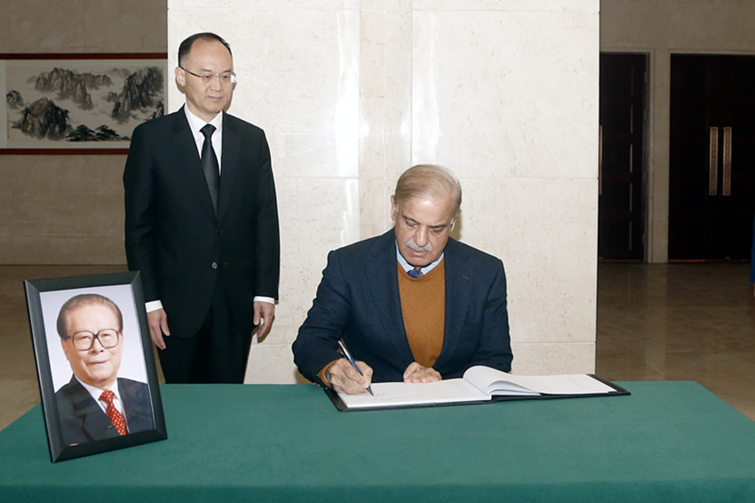 12月1日,巴基斯坦總理夏巴茲在中國駐巴基斯坦大使館吊唁江澤民同志。 艾哈邁德·卡邁勒 攝(新華社 發(fā))