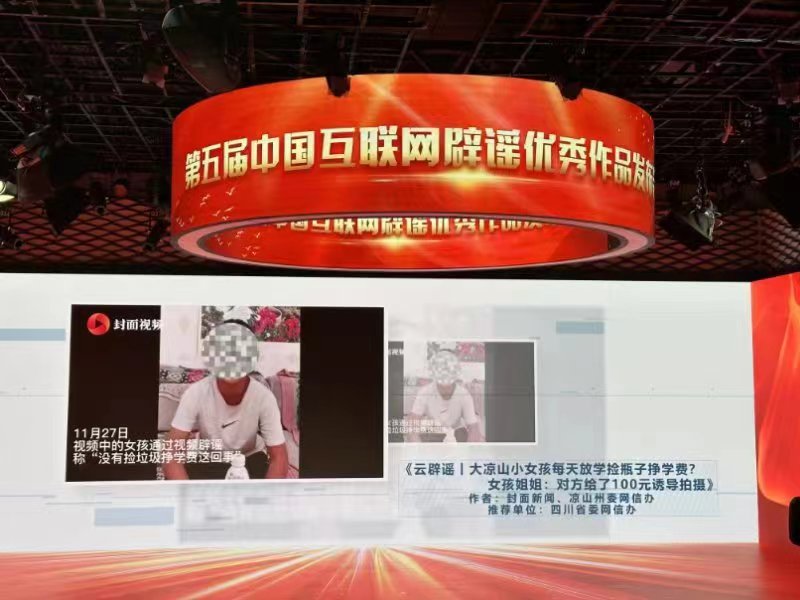 由涼山州委網(wǎng)信辦、封面新聞制作的《云辟謠 | 大涼山小女孩每天放學(xué)撿瓶子掙學(xué)費?女孩姐姐:對方給了100元誘導(dǎo)拍攝》(點擊查看作品)獲得網(wǎng)絡(luò)辟謠版塊社會民生類獎項。
