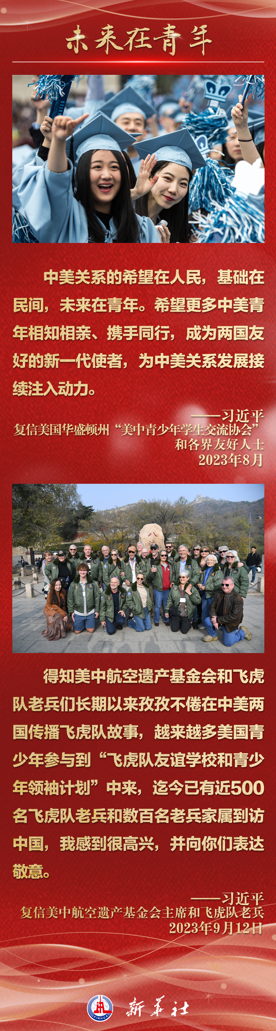 今年以來,從在京會見美國各界人士,到向“鼓嶺緣”中美民間友好論壇等活動致賀信,再到復信美國華盛頓州“美中青少年學生交流協(xié)會”、史迪威將軍后人、飛虎隊老兵等友好人士,習近平主席同美國各界真摯互動,強調(diào)中美關系基礎在民間,希望在人民,未來在青年,活力在地方。