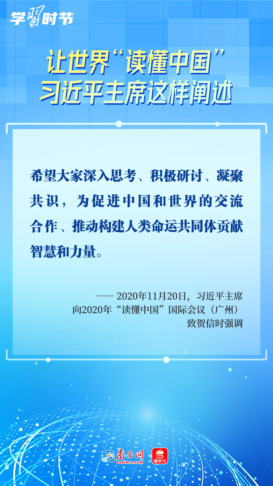 習(xí)近平主席高度重視“讀懂中國”國際會議,多次會見與會代表、向會議致辭或致賀信,闡述中國的發(fā)展道路、改革開放、對外政策等,讓我們一同學(xué)習(xí)。