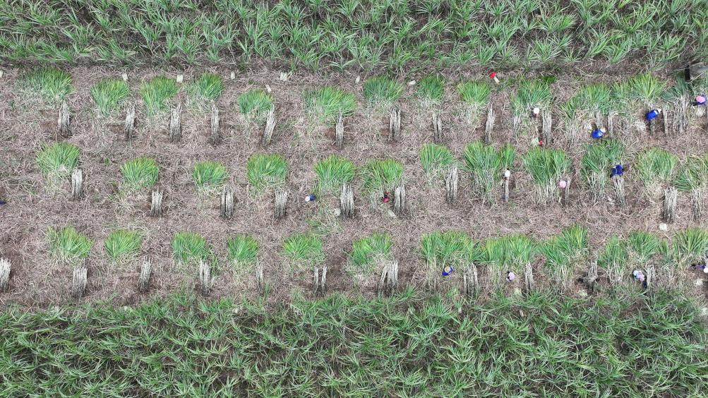近日,無人機拍攝的廣西來賓市興賓區(qū)蔗農(nóng)正在砍收甘蔗。 新華社記者 周華 攝