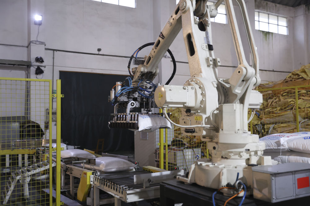 12月14日,在廣西來賓東糖鳳凰有限公司,機(jī)械臂在廠房碼放白砂糖成品。