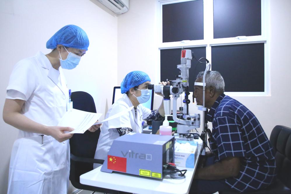 ??2023年2月4日,在馬爾代夫首都馬累附近的胡魯馬累醫(yī)院,中國(guó)-馬爾代夫眼科中心中方專家為當(dāng)?shù)鼗颊咦鲅劭茩z查。