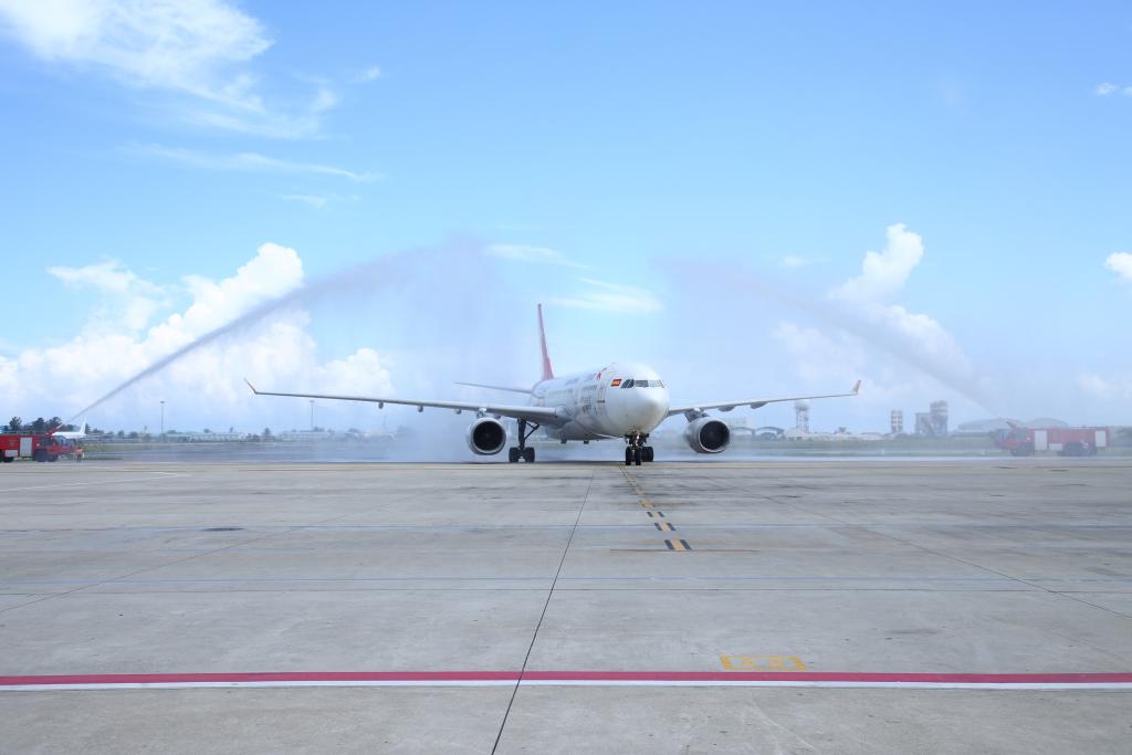 ??2023年1月18日,中國(guó)首都航空J(rèn)D455航班在馬爾代夫馬累維拉納國(guó)際機(jī)場(chǎng)接受水門禮。