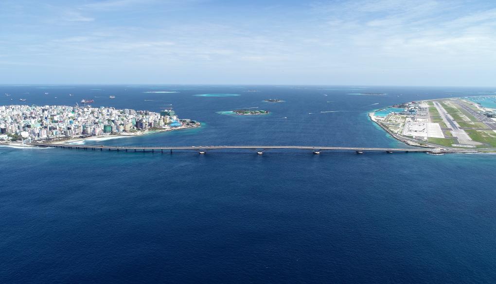 ??這是航拍的連接馬爾代夫首都馬累和機(jī)場(chǎng)島的中馬友誼大橋。