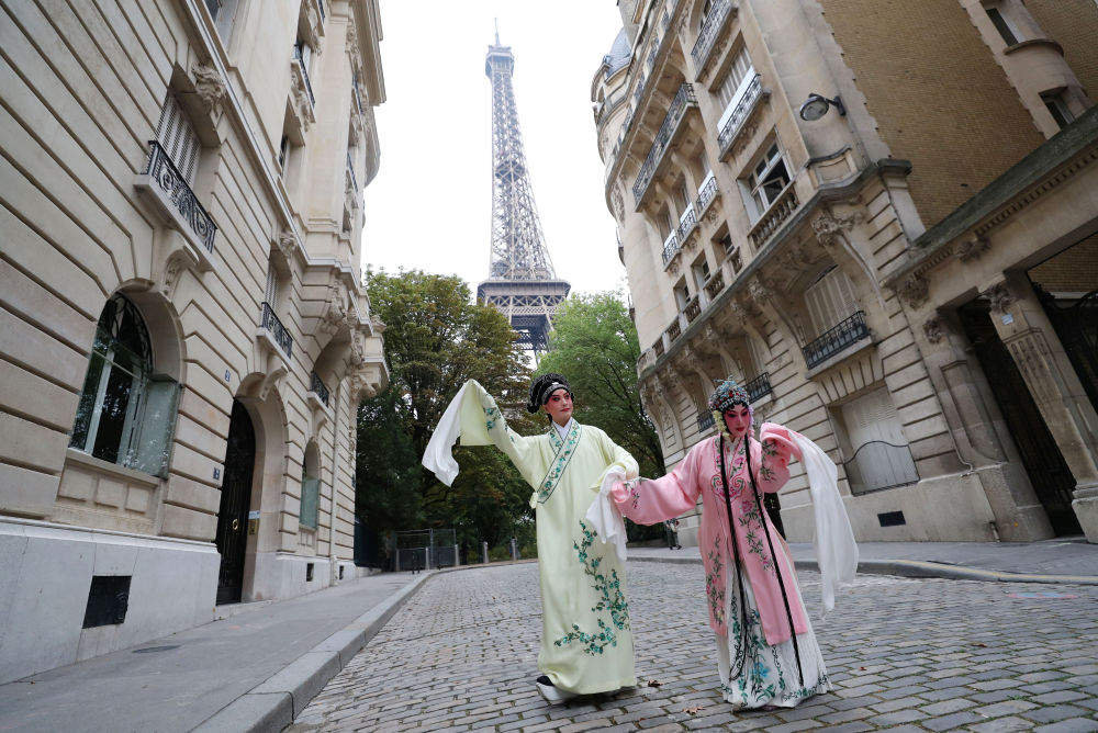 2023年9月13日,江蘇省演藝集團(tuán)昆劇院院長(zhǎng)施夏明(左)和江蘇省演藝集團(tuán)昆劇院國(guó)家一級(jí)演員孔愛(ài)萍在法國(guó)巴黎埃菲爾鐵塔附近參加昆曲快閃。新華社記者 高靜 攝