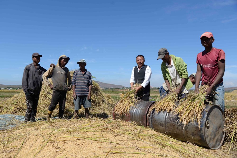在馬達(dá)加斯加首都塔那那利佛附近的馬義奇鎮(zhèn),中國(guó)雜交水稻技術(shù)專(zhuān)家胡月舫(右三)在中國(guó)國(guó)家雜交水稻工程技術(shù)研究中心非洲分中心的試驗(yàn)田里和當(dāng)?shù)剞r(nóng)民一起收獲水稻(2023年5月12日攝)。新華社發(fā)(西塔卡·拉喬納里松攝)