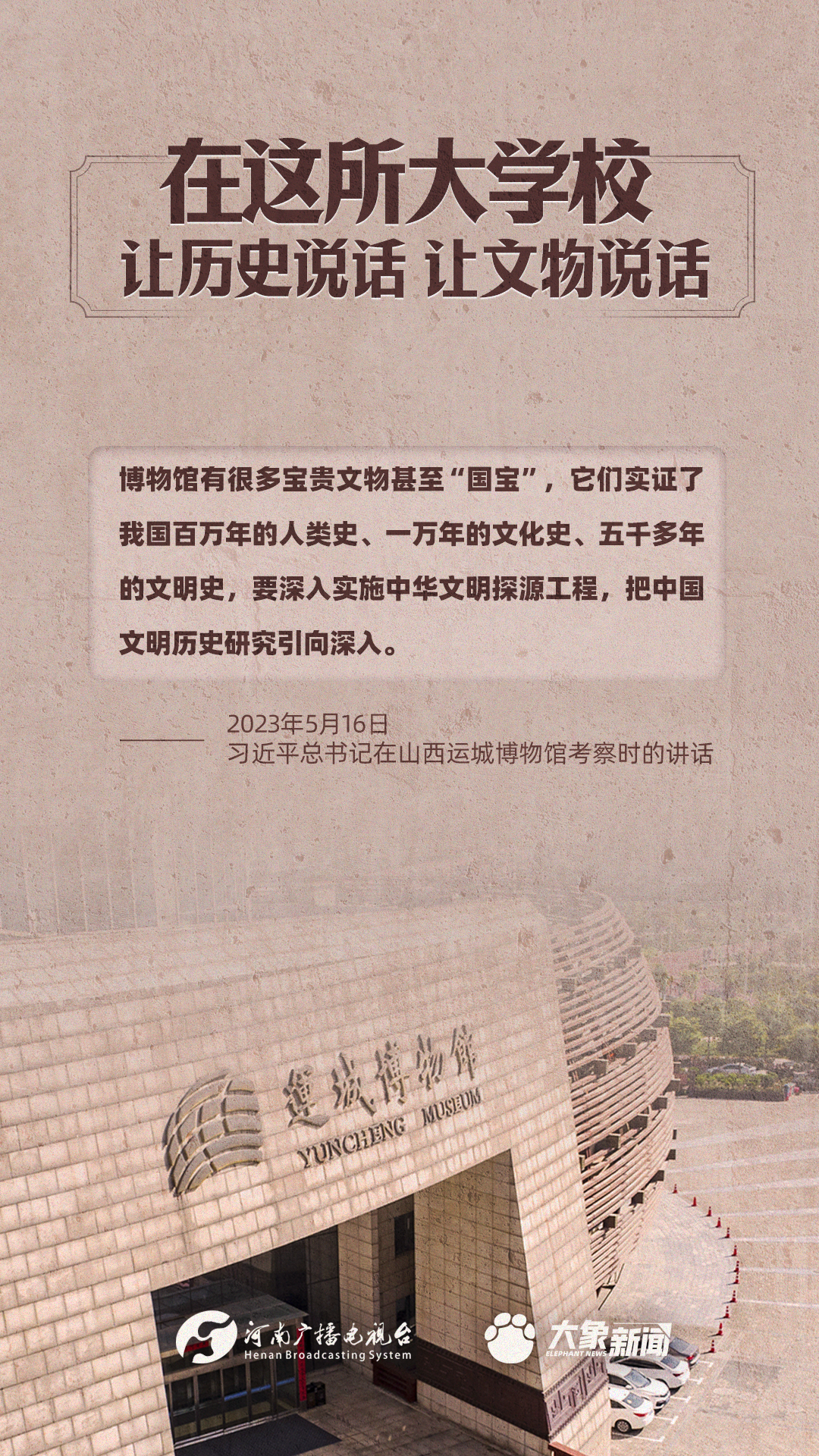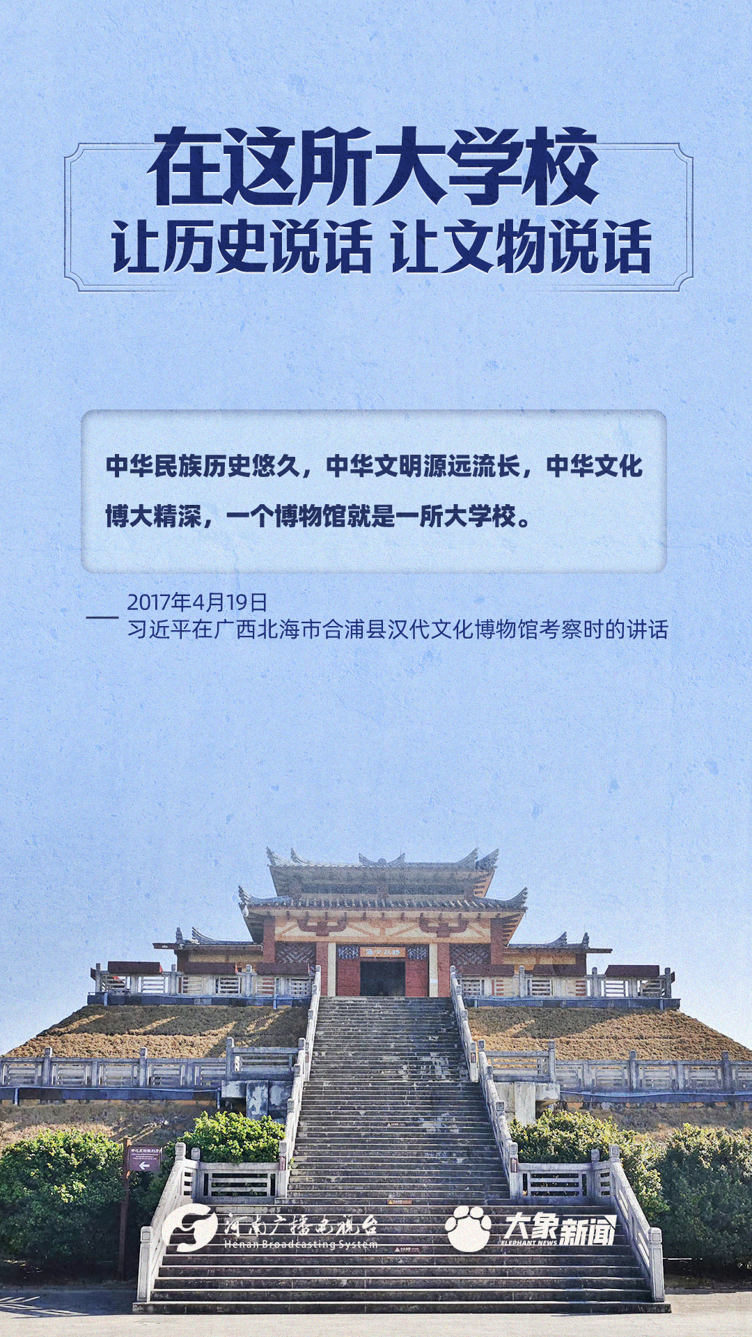 習(xí)近平總書記一直高度重視博物館工作,多次作出重要講話,強(qiáng)調(diào)“一個博物院就是一所大學(xué)校”,指出“讓歷史說話,讓文物說話”,要求“守護(hù)好、傳承好、展示好中華文明優(yōu)秀成果”等等,金句連連。大象新聞進(jìn)行了認(rèn)真梳理,邀您一起學(xué)習(xí)。