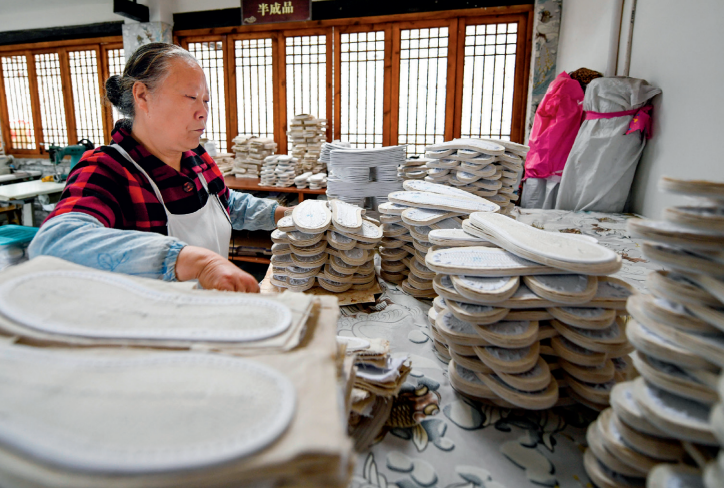 △ 2020年4月17日,成都市郫都區(qū)唐昌街道戰(zhàn)旗村,賴淑芳整理擺放制作完成的布鞋鞋底。