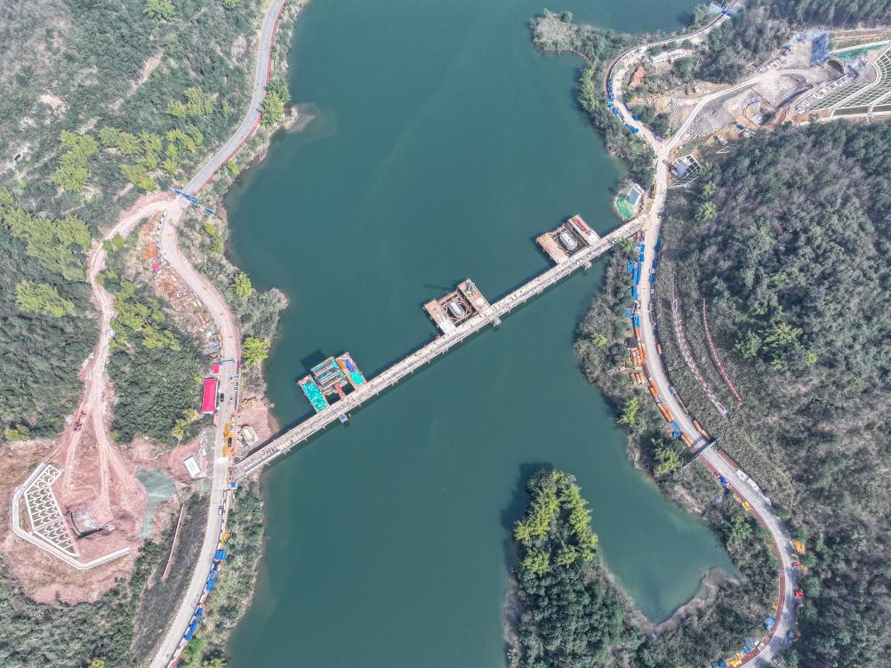 ??這是2月19日拍攝的位于重慶市銅梁區(qū)的成渝中線高鐵玄天湖大橋建設(shè)現(xiàn)場(無人機照片)。新華社記者 唐奕 攝