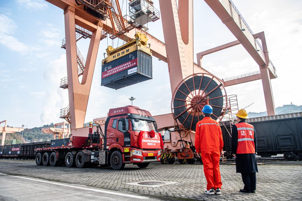??1月4日,在重慶萬州新田港站,工作人員進行集裝箱吊裝作業(yè),將專列貨物轉(zhuǎn)運至公路物流環(huán)節(jié)。新華社記者 唐奕 攝