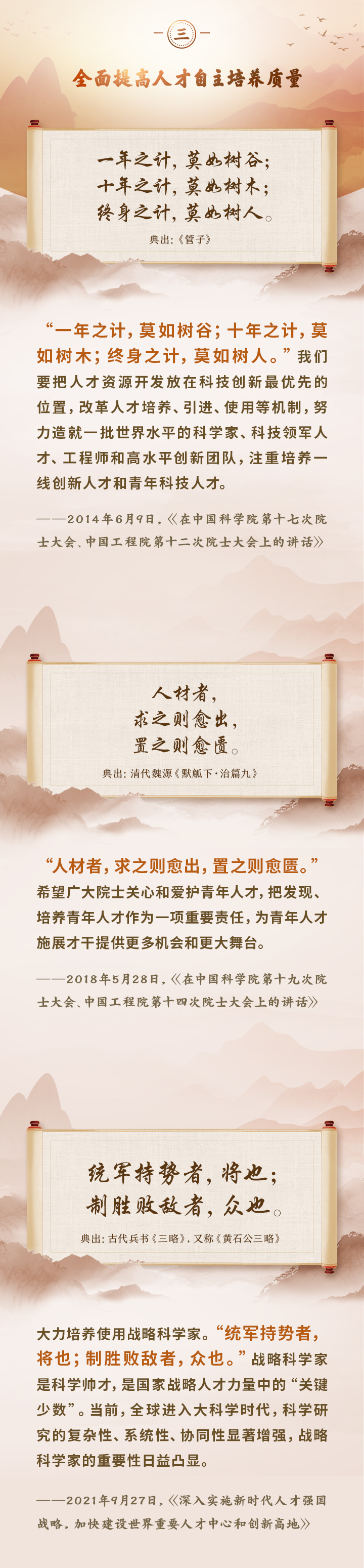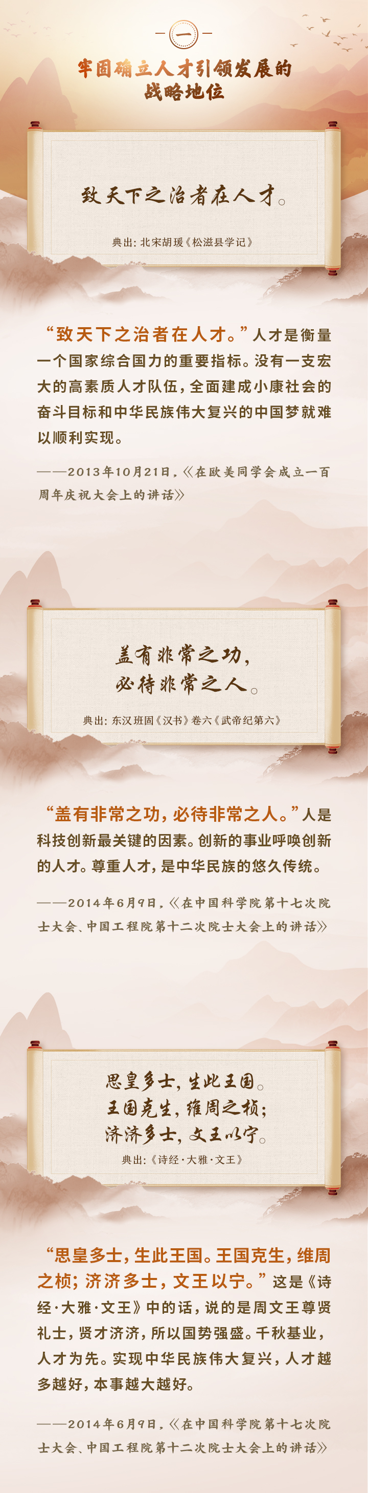 編者按:培養(yǎng)造就大批德才兼?zhèn)涞母咚刭|(zhì)人才,是國家和民族長遠發(fā)展大計。黨的十八大以來,習近平總書記圍繞人才工作發(fā)表一系列重要論述,立意高遠,內(nèi)涵豐富,思想深刻,深刻回答了為什么建設(shè)人才強國、什么是人才強國、怎樣建設(shè)人才強國的重大理論和實踐問題。在這些重要論述中,總書記精妙運用古代典籍、經(jīng)典名句,以古喻今、啟迪思想、激蕩精神,讓我們一起來學習!