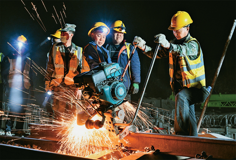 2024年4月10日,在內(nèi)蒙古包頭市,包銀高鐵引入包頭樞紐工程的關(guān)鍵控制性工程之一——包西上行線路撥接完成施工。此次施工完成,標(biāo)志著包銀高鐵引入包頭樞紐包頭站改造工程取得重大進(jìn)展,為包銀高鐵開(kāi)通奠定堅(jiān)實(shí)基礎(chǔ)。圖為4月10日凌晨,工人在包西上行線路上作業(yè)。 新華社記者 劉磊/攝