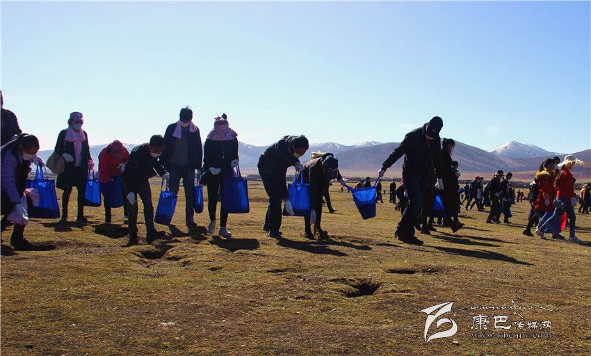 5月11日,距石渠縣城約5公里處的草原上人聲鼎沸,格外熱鬧。一大早,來自各單位的300余名黨員干部便聚集到了這里,身穿紅背心的青年志愿者們正忙著為大家分發(fā)口罩、手套等勞動物品。而在人群最前端,一輛拖拉機(jī)滿載著一車類似飼料的東西,七八個人正有條不紊地將“飼料”卸車并分裝進(jìn)數(shù)百個藍(lán)色環(huán)保袋中。