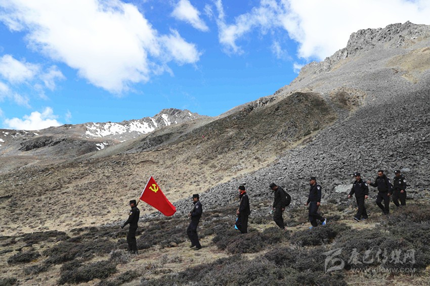 為確保蟲草采挖期間的社會(huì)治安穩(wěn)定,縣公安局抽調(diào)精干力量,前往哈幾山、莫庫溝等多個(gè)蟲草采挖點(diǎn)開展巡山維穩(wěn)。這次和我們一起開展常規(guī)巡邏的共有8名公安干警。降初是本地人,1.78米的個(gè)子,一路上,他高舉黨旗、步履矯健、勇往直前,成為我們大家的“領(lǐng)路人”,大家經(jīng)常和他開玩笑說:“跟著黨(旗)走永遠(yuǎn)不迷路”。