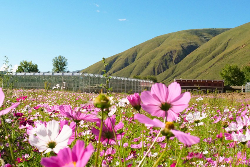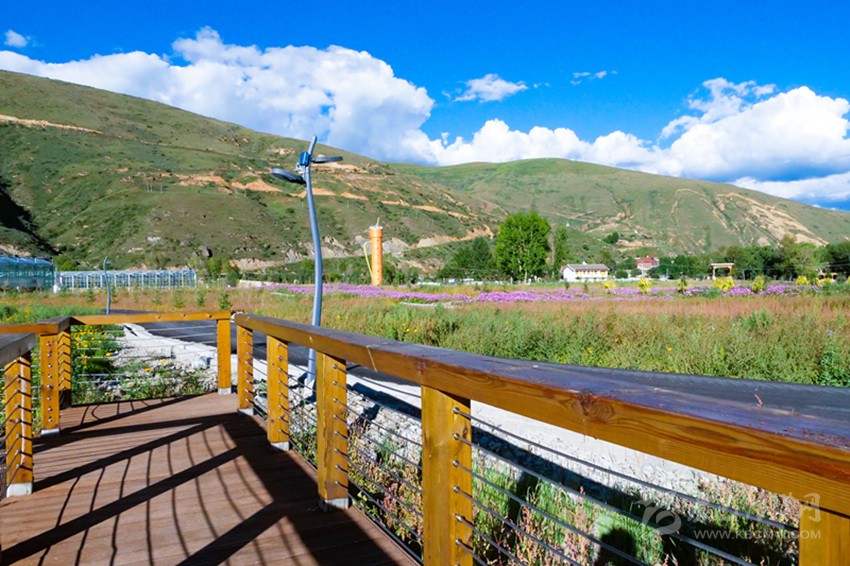 陽光下,成片開放的波斯菊搖曳生姿,成片白楊林包圍著12個16—25平方米不等的仿道孚民居外觀的樹屋,沿著鵝卵石鋪設、牡丹點綴的棧道漫步,兩側(cè)種植著落葉松、金葉垂榆、康定木蘭、五小葉槭等32種具有高原特色的植物,樹下種植以虞美人、百葉菊等17種花卉為主的草本植物;來到湖心島,不少人坐在其間休閑,有的坐在樹下乘涼,有的坐在溪邊聊天,還有不少人在伸臂橋上照相,不遠處透明的玻璃溫室展覽館已經(jīng)完成建設,走過開滿桃花的拱形門,陽光灑在地面上讓人心生暖意,廢棄的水塔變成了打酥油茶用的醬桶,山、水、溪、樹、花、屋構(gòu)成了不同意境的高原園林景觀。