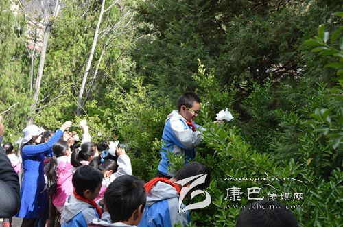 學生們將祭奠的白花系在樹上。