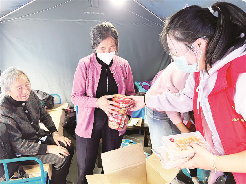 身穿紅色背心的志愿者向受災群眾發(fā)放食品。