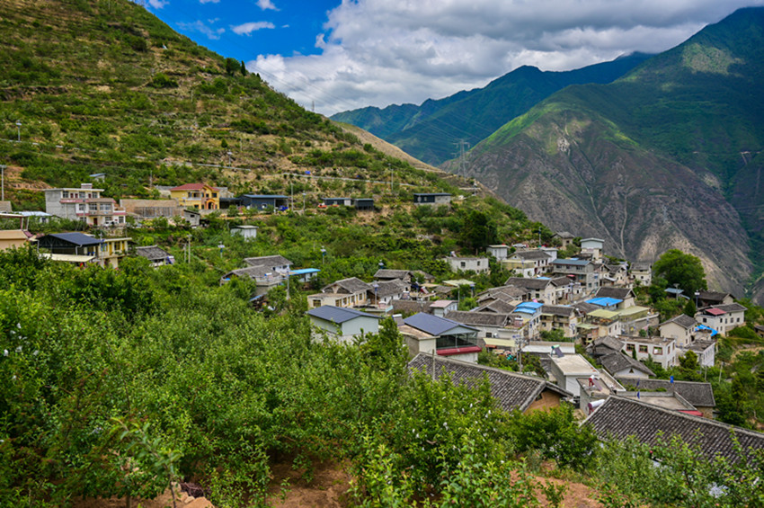 仲夏時(shí)節(jié),漫步在藍(lán)天白云下的黃草坪村,一個(gè)個(gè)雞蛋大小的蘋(píng)果、枇杷掛滿枝頭,撲面而來(lái)的果香味沁人心田。放眼望去,山谷間一團(tuán)團(tuán)云霧纏繞在大山峭壁間,山腳下,大渡河猶如一條青色的綢緞,歡騰的河水正述說(shuō)如今黃草坪村的幸福生活。