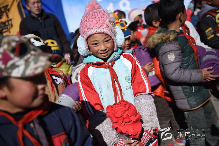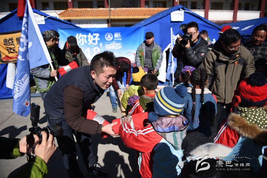 新華網(wǎng)“你好,318”全媒體行活動領(lǐng)隊黨文伯為孩子送防寒毛毯(薛玉斌 攝)