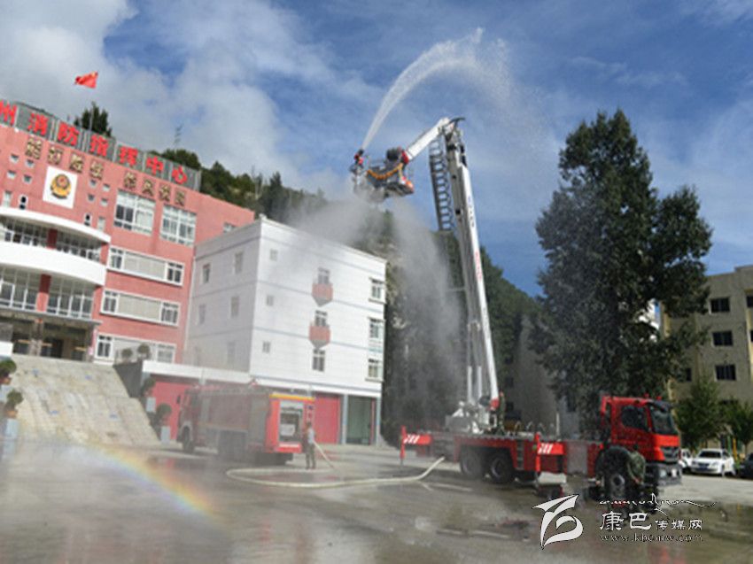 本網(wǎng)訊(劉國謙文/圖9月8日上午,甘孜消防支隊操場衛(wèi)聳立著一道“銀色天梯”,筆者在現(xiàn)場目擊了 DG-32C登高平臺消防車的變形過程。隨著 4個支撐架的展開,車體被架離地面,登高平臺臂緩緩上升,如“擎天柱”般伸向云端。在兩名駕駛員的配合操作下,平臺頂端配載的水炮噴射出一條長長的水龍,隨著水壓漸漸加大,奔騰的水龍帶著一道彩虹劃過高空,成為云端深處一道壯觀的麗景。