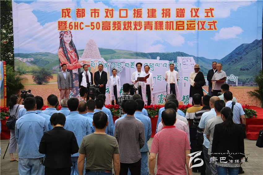 成都市委常委謝瑞武宣布50套全自動高頻青稞烘炒機啟運甘孜州。