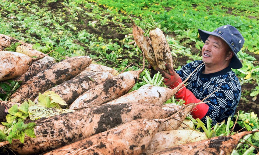 2018年12月22日,在海拔3600米的理塘縣濯桑鄉(xiāng)康藏陽(yáng)光蔬菜生產(chǎn)加工基地,村民們正在采收水果蘿卜。這批水果蘿卜將遠(yuǎn)銷港澳市場(chǎng)。水果蘿卜在香港的零售價(jià)是每公斤20港元,約合人民幣17元多。