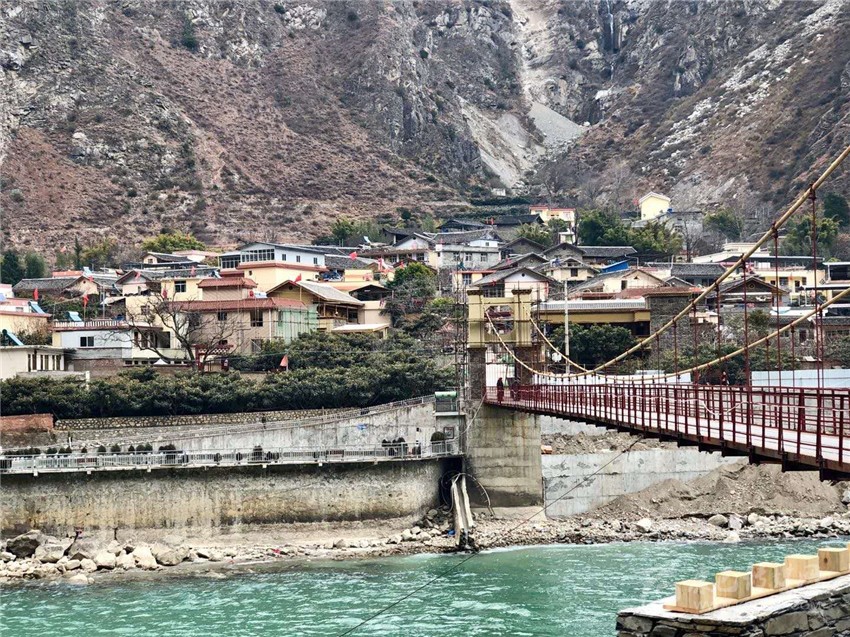 來到時濟鄉(xiāng),鐵索橋?qū)Π毒褪侨艏?,流淌的大渡河水從橋下穿過,若吉村內(nèi)正在進行民居風(fēng)貌升級改造,一些改造的民居外形已初顯。