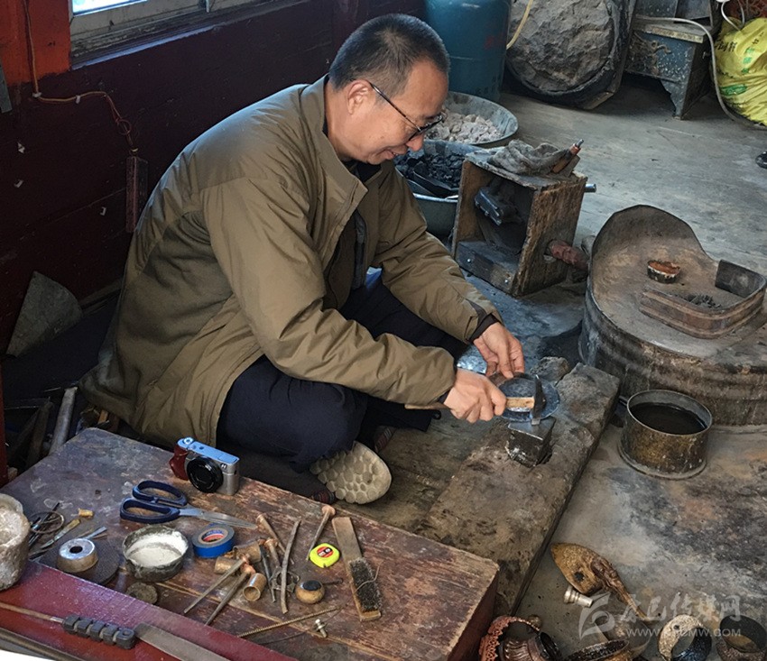 河坡民族金屬手工技藝歷史悠久,盛行于藏民族英雄嶺·格薩爾時(shí)期,至今大約有1300多年的歷史。調(diào)研組每到一處,都要與手工藝人們進(jìn)行深入細(xì)致的交談。在手工藝傳承人布洛家中,見到了正在忙碌制作各種手工藝產(chǎn)品的場(chǎng)景,專家們立即拿出相機(jī)開始拍照。同時(shí)抑制不住激動(dòng)的心情,參加到制作中去,有人一邊手持工具現(xiàn)場(chǎng)體驗(yàn)河坡民族手工藝的鍛造,一邊饒有興致地說(shuō):“這里好似人間仙境,就如站在云端學(xué)手藝”。