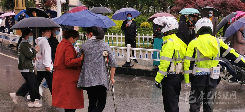 這邊剛幫助考生尋回遺失的準考證,那邊一名杵著拐杖的考生引起了執(zhí)勤交警的注意,這時這名考生在家長的攙扶下正準備過馬路,交警見狀,立即上前為其疏導交通,開辟出綠色通道。記者了解到,這名考生叫段尚玲,兩周前意外摔傷了腿,這給她的應試之路帶來了不少麻煩,幸好在交警的幫助下,她安全順利地進入了考場。