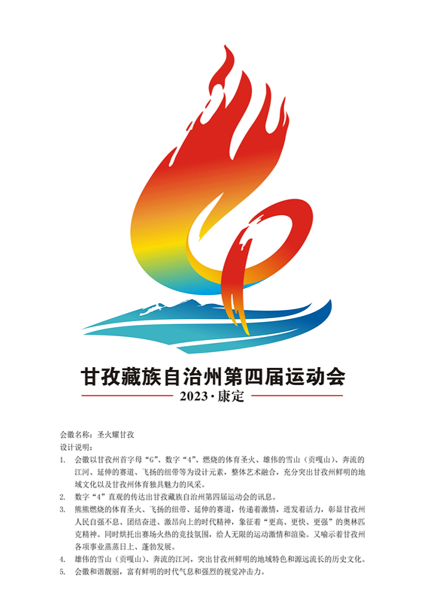 據(jù)王拓進(jìn)介紹,會(huì)徽設(shè)計(jì)靈感來自網(wǎng)上看到的貢嘎雪山,所以作品以甘孜州首字母“G”、數(shù)字“4”、燃燒的體育圣火、雄偉的雪山(貢嘎山)、奔流的江河、延伸的賽道、飛揚(yáng)的紐帶等為設(shè)計(jì)元素。數(shù)字“4”直觀地傳達(dá)出甘孜州第四屆運(yùn)動(dòng)會(huì)的訊息;雄偉的雪山(貢嘎山)、奔流的江河,突出甘孜州鮮明的地域特色和源遠(yuǎn)流長的歷史文化;熊熊燃燒的體育圣火、飛揚(yáng)的紐帶、延伸的賽道,傳遞著激情、迸發(fā)著活力,彰顯甘孜州人民自強(qiáng)不息、團(tuán)結(jié)奮進(jìn)、激昂向上的時(shí)代精神,象征著“更高、更快、更強(qiáng)”的奧林匹克精神,同時(shí)烘托出賽場火熱的競技氛圍,給人無限的運(yùn)動(dòng)激情和渲染,又喻示著甘孜州各項(xiàng)事業(yè)蒸蒸日上、蓬勃發(fā)展。