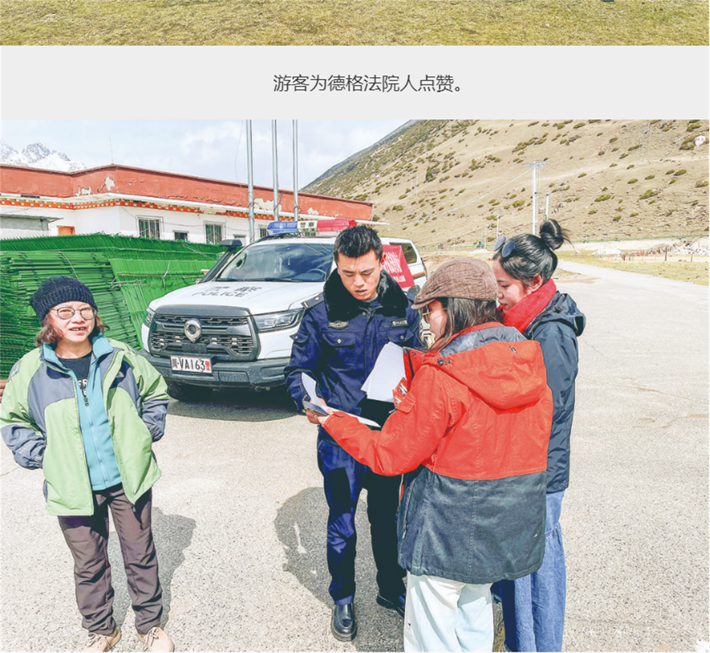 考慮到玉龍拉措景區(qū)與德格縣城區(qū)之間距離較遠,為了確保游客能及時享受到便捷且高效率的司法服務,馬尼干戈法庭的工作人員專門設立了景區(qū)旅游訴訟服務點。這個點位全天候開放,以最貼心細致的服務,全方位滿足游客的司法需求,為遇到旅游糾紛的游客答疑解惑,與景區(qū)工作人員、攤點商戶交流,了解他們的法律需求,向其宣傳《旅游法》《價格法》等涉旅法律知識。同時,該法庭工作人員還當起了景區(qū)臨時“導游”,為游客介紹轄區(qū)乃至全縣的景區(qū)景點,提供吃、住、行等方面的游玩資訊,獲得了游客們的一致好評和點贊。