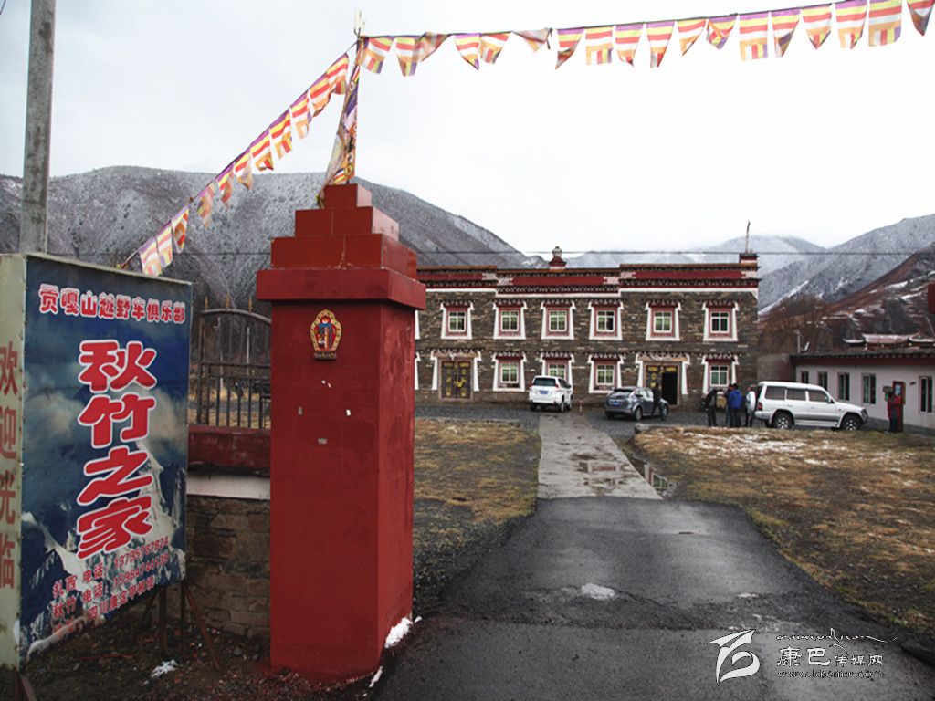 在距鄉(xiāng)政府不遠(yuǎn)的營九路邊上,有一個(gè)“貢嘎山越野車俱樂部·秋竹之家”的燈箱廣告。在雪山的映襯下,這個(gè)不大的燈箱廣告顯得格外引人注目。步入“秋竹之家”的大門,進(jìn)入眼簾的是一幢民族風(fēng)格濃郁的建筑,黑白紅三色相間的墻面,還沒有吐綠的院壩,所有的一切,都讓記者看不出這幢建筑與普通民居有什么不同的地方。