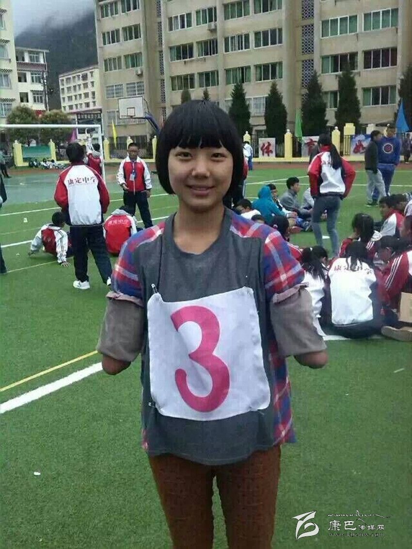 在康定中學(xué)校園里,你會邂逅這樣一位女孩:臉上永遠(yuǎn)燦爛著陽光般的微笑,雙眼永遠(yuǎn)閃爍著自信樂觀的光芒。教室里,她聚精會神地聽課;圖書館里,她專心致志地讀書;操場上,她身輕如燕地奔跑;寢室里,她開心爽朗地和同學(xué)交流。可你仔細(xì)一看,她竟然沒有雙臂,就像折翼的天使。她就是該校高2016屆8班學(xué)生,羌族女孩許方燕。行走在高原的風(fēng)中,她是一幀讓每一個人內(nèi)心泛起感動漣漪的美麗風(fēng)景……