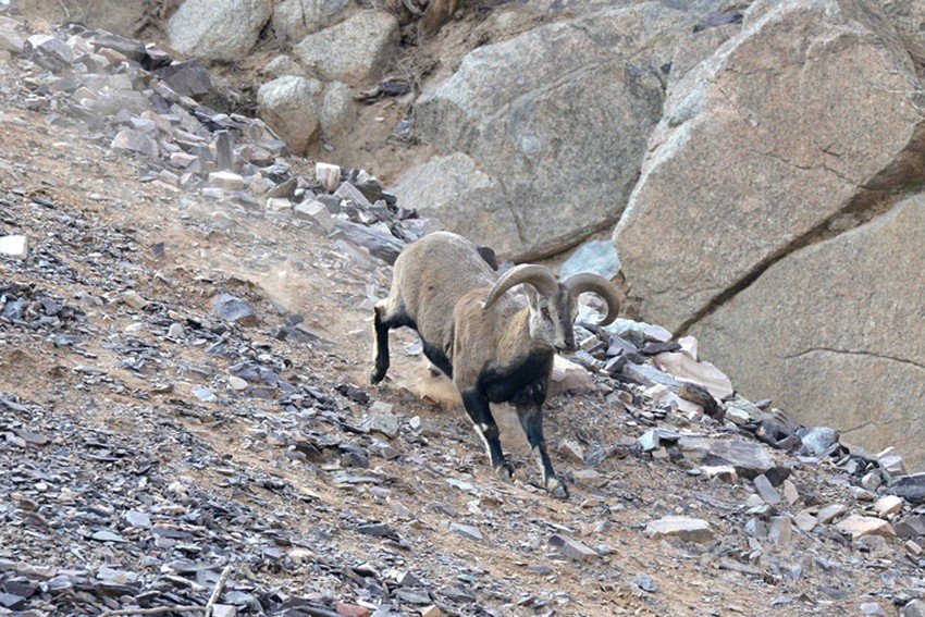 在回程的時(shí)候又看到一群巖羊,大約有20余只。這次與它們接近的距離僅有5、6米的地方。它們在隊(duì)員們的面前若無其事地吃草,只有一只母羊抬頭看了隊(duì)員們一會兒。和這只母羊如此近距離接近,以至于能看清它的眼神里似乎只有一些疑惑,卻沒有恐懼。
