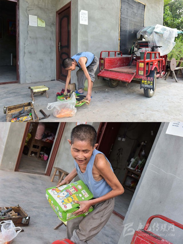 “周強(qiáng)善曾是全鄉(xiāng)最困難的貧困戶?!敝行泥l(xiāng)黨委書記楊壘說,周強(qiáng)善的妻子在剛生下女兒后因病去世。2005年,他在外務(wù)工時(shí)右腿受傷,留下殘疾。后來他自學(xué)補(bǔ)鞋技術(shù),成了一名鞋匠,但腿腳不便、下山路不通,三娃多年“悶”在家里。