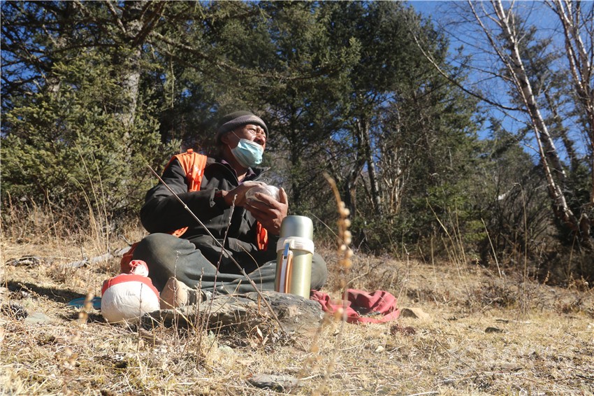 巡山護(hù)林的路并不好走,很多羊腸小道都是盤旋在陡坡峭壁之間,有的地方甚至需要小心翼翼側(cè)身而過。在巡山過程中,澤翁仁真總是非常仔細(xì)地邊走邊看,查看林中是否有非法進(jìn)入人員活動的痕跡,是否有亂砍濫伐、非法盜獵的情況。他總是眼觀六路、耳聽八方,觀察林中的風(fēng)吹草動,經(jīng)常是汗流浹背。累了就找塊空地坐著小憩一會兒,餓了就拿出背包里的酥油茶和糌粑,簡單的吃上幾口,而此時的酥油茶早就沒了剛打好的滾燙,僅剩一絲余溫。