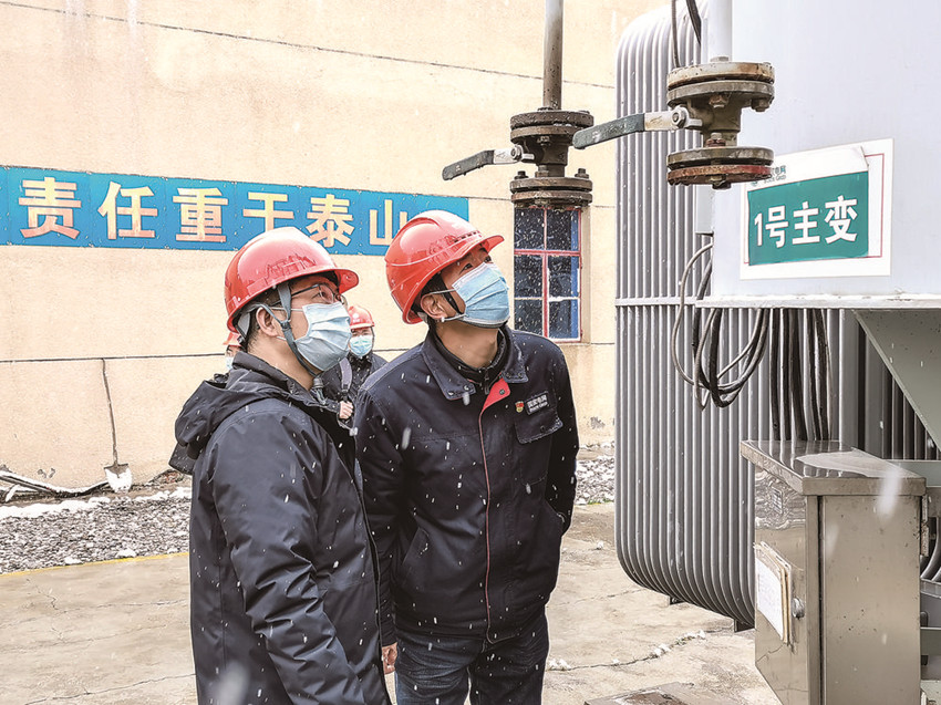 戴林(右)對(duì)城南變電站主變進(jìn)行檢查。