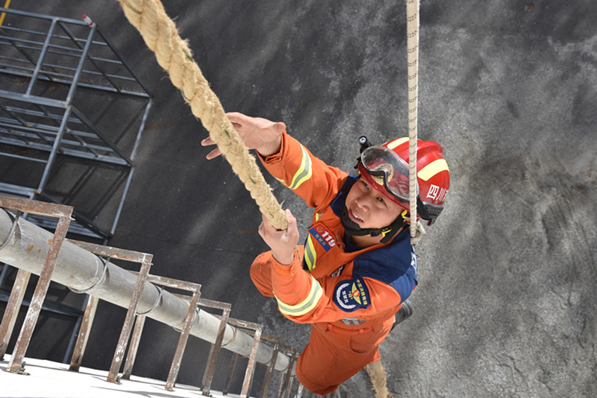 危急時(shí)刻,姜鵬和隊(duì)友迅速開展救援行動(dòng)。姜鵬在做好個(gè)人防護(hù)后,立即將救生繩索拴在腰上,從10余米高處一躍而下,利用繩索迅速下降,快速地將被困女子固定住,成功將女子救出。