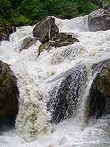 溝外交通與燕子溝大致相同,從南門(mén)關(guān)溝至兩河口14.5千米,在這里分做兩條路,一條往西南去牛園子和冰川,一條往西北去蟲(chóng)草棚子(二號(hào)營(yíng)地)和冰川。這里沒(méi)有食宿,道路艱險(xiǎn),馬不能通行,需要當(dāng)?shù)叵驅(qū)А?/p>
